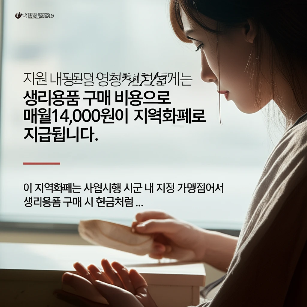 본 사업은 청소년복지 지원법에 근거하여 만 11세부터 18세 여성청소년에게 매월 14,000원을 지역화폐로 지급하며, 타 저소득층 생리용품 지원 사업과는 중복 수혜가 불가합니다.
