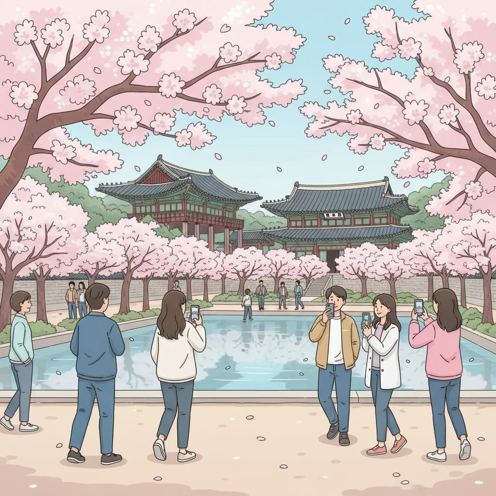 "벚꽃은 만개 후 약 일주일간이 가장 아름다운 절정기입니다. 봄바람과 비 소식 등 날씨 변수를 고려한다면 4월 첫째 주 평일 저녁, 고즈넉한 고궁에서의 퇴근길 데이트가 최고의 선택이 될 거예요!"